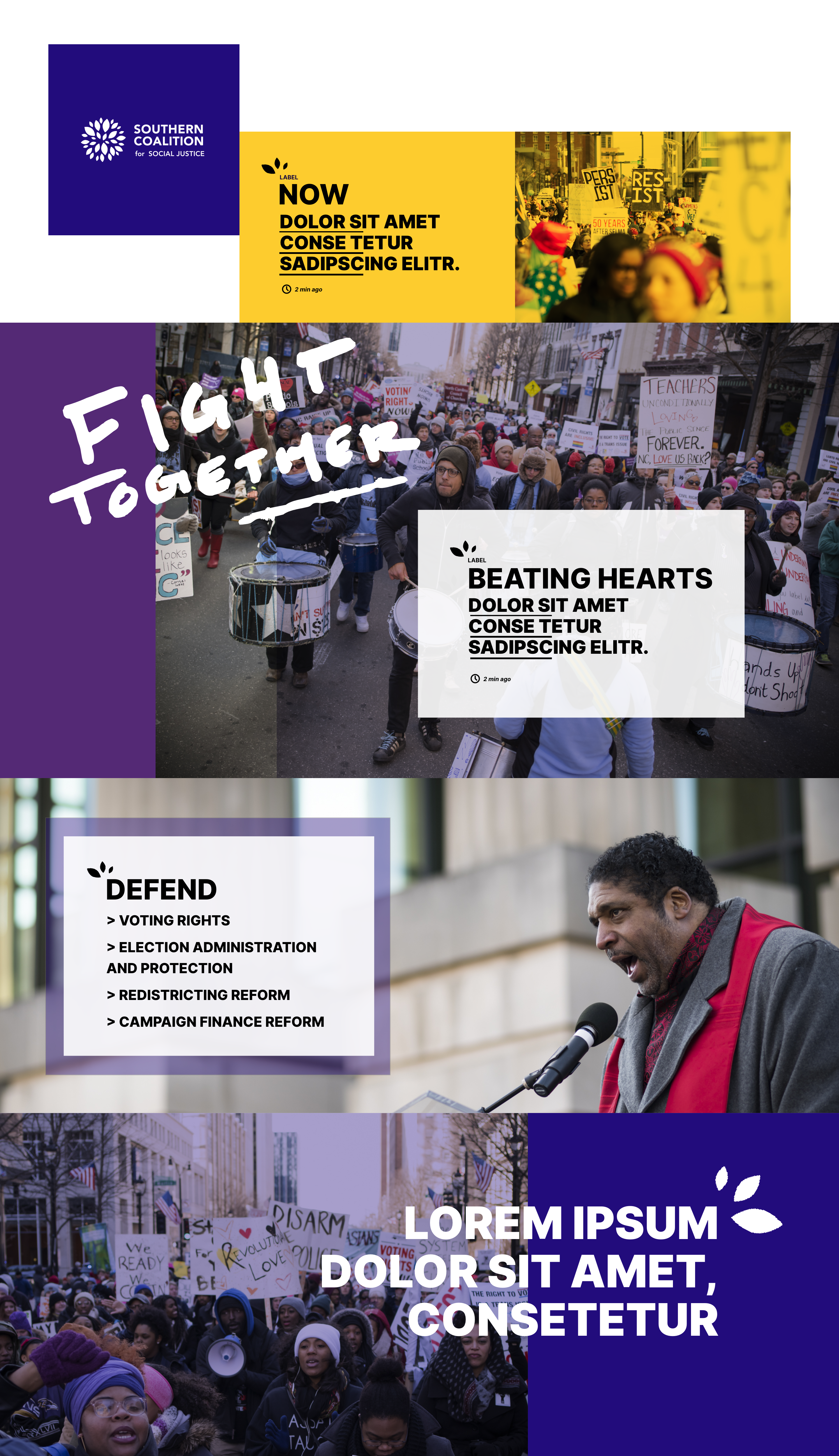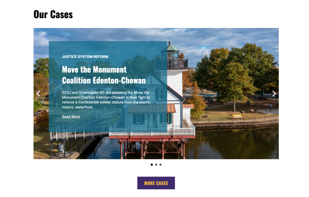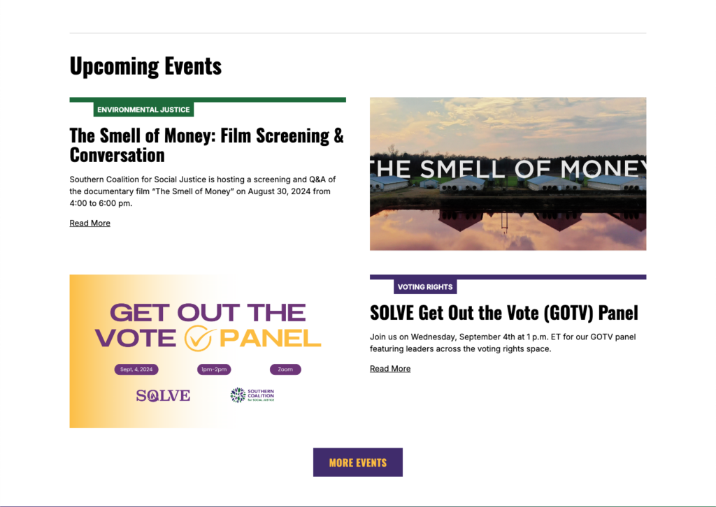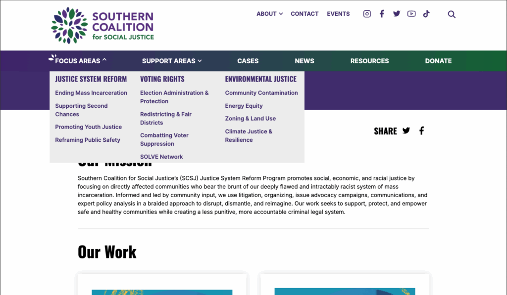The Southern Coalition for Social Justice website employs a clear and functional design, prioritizing accessibility and engagement. The homepage features bold, legible typography, a clean layout, and balanced white space, which guides attention to key content. High-contrast color accents and strategic imagery reinforce the organization’s focus on community impact and justice. The navigation is straightforward, with structured menus and calls to action to encourage exploration. Overall, the design reflects professionalism, inclusivity, and the mission-driven ethos of the organization.